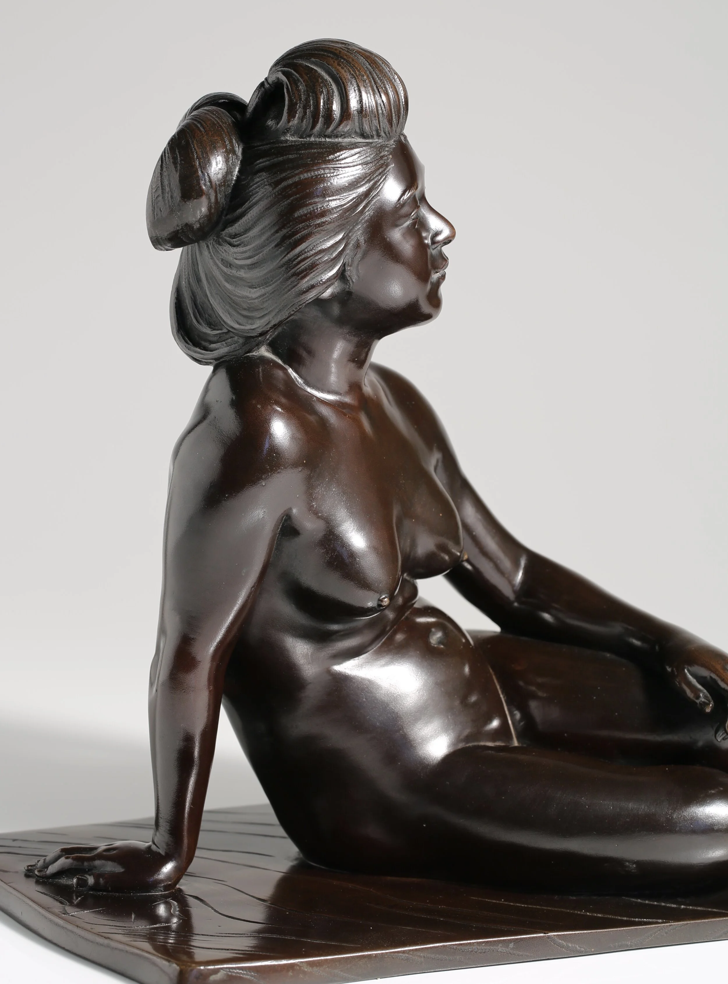 This sensitive and delicately finished bronze is both artistically and technically a superb example of Japanese Meiji period sculpture. It is also a very rare subject matter, the depiction of the nude figure was almost unheard of in Japanese art before the Meiji period and this subject matter displays the European influence on Japanese artists following their exposure to Classical, Renaissance and indeed contemporary sculpture in late 19th and early 20th century Europe. In many ways, it is a depiction of Venus in the classical tradition.
